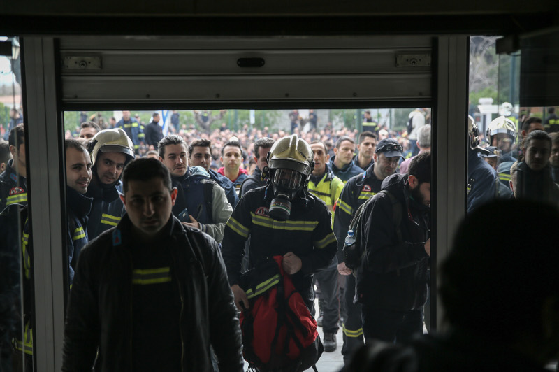 Οι πυροσβέστες έσπασαν τον αστυνομικό κλοιό και επάνω στην ένταση έσπασαν και τη γυάλινη πόρτα του κτιρίου, μπαίνοντας σε αυτό και κάνοντας καθιστική διαμαρτυρία, φωνάζοντας συνθήματα κατά της κυβέρνησης.