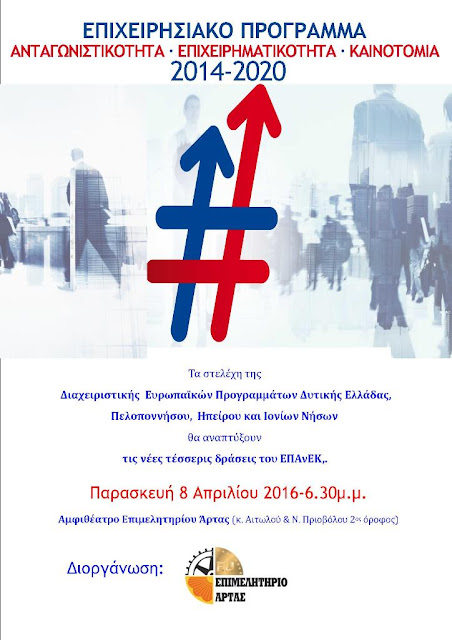 Ενημερωτική εκδήλωση με θέμα «ΕΣΠΑ 2014-2020 – Επιχειρησιακό Πρόγραμμα: «Ανταγωνιστικότητα, Επιχειρηματικότητα και Καινοτομία» συνδιοργανώνουν το Επιμελητήριο Άρτας και η Διαχειριστική Ευρωπαϊκών Προγραμμάτων Δυτικής Ελλάδας, Πελοποννήσου, Ηπείρου και Ιονίων Νήσων την Παρασκευή 8 Απριλίου 2016 στις 6.30 μ.μ., στο Επιμελητηριακό Μέγαρο (κ. Αιτωλού & Ν. Πριοβόλου).