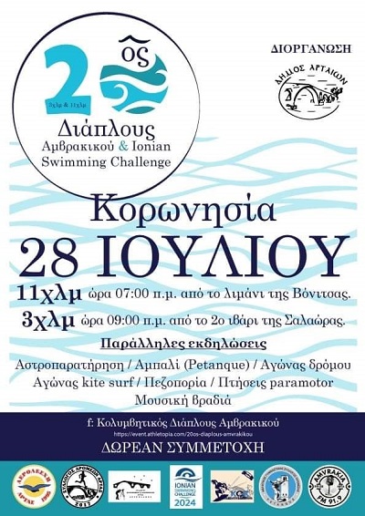 Ο “Διάπλους” διεξάγεται στη θάλασσα του Αμβρακικού Κόλπου με εκκίνηση από τη Βόνιτσα και τερματισμό στην Κορωνησία, και το «Ionian swimming challenge», διεξάγεται την ίδια μέρα με κολυμβητική διαδρομή από την Σαλαώρα στην Κορωνησία.