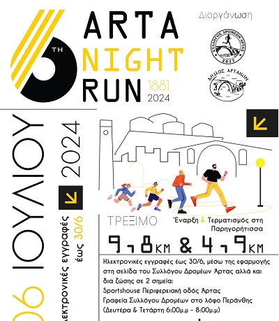 Το Σάββατο 6 Ιουλίου 2024, η Άρτα θα ζήσει μια μαγική βραδιά με δράση, καθώς ο Δήμος Αρταίων και ο Σύλλογος Δρομέων Άρτας, διοργανώνουν τον 6ο Νυχτερινό Αγώνα Δρόμου «Arta Night Run 1881». Αυτή η ξεχωριστή αθλητική εκδήλωση συνδυάζει την ομορφιά της νύχτας με την ιστορία και την παράδοση της πόλης, τιμώντας την απελευθέρωσή της, την 24η Ιουνίου 1881. Δρομείς κάθε ηλικίας και επιπέδου, από επαγγελματίες αθλητές μέχρι ερασιτέχνες και λάτρεις του τρεξίματος, θα έχουν την ευκαιρία να διασχίσουν τους ιστορικούς δρόμους της Άρτας. Με εκκίνηση από την πλατεία Σκουφά στις 21:00, η νύχτα μετατρέπεται σε φωτεινό σκηνικό και υπόσχεται ενέργεια και εορταστική διάθεση.
