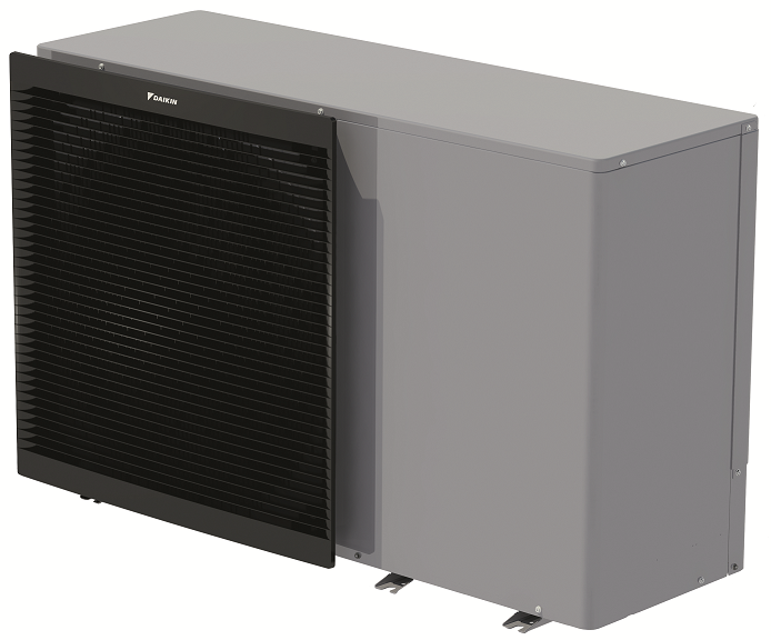 Η εξωτερική μονάδα Daikin Altherma 3 είναι καθαρή, μινιμάλ και απλή. Οι μαύρες οριζόντιες γρίλιες καλύπτουν ολόκληρη την μπροστινή πλάκα ώστε να κρύβεται ο μονός ανεμιστήρας και να μειώνεται ο θόρυβος λειτουργίας. Το γκρι ματ φινίρισμα αντικατοπτρίζει το χρώμα του εξωτερικού τοίχου ώστε να μπορεί η μονάδα να ενσωματώνεται σε διαφορετικά περιβάλλοντα και τοπία.