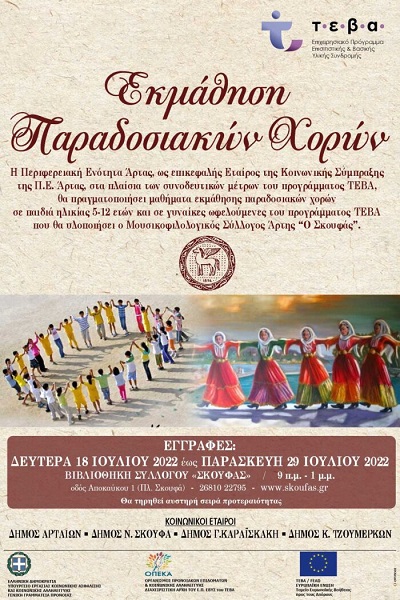 Έως την Παρασκευή 29 Ιουλίου μπορούν να δηλώνουν την συμμετοχή τους οι ωφελούμενες γυναίκες και παιδιά ηλικίας 5-12 ετών του προγράμματος ΤΕΒΑ, στα μαθήματα εκμάθησης παραδοσιακών χορών. Τα μαθήματα θα διεξαχθούν από τον Μουσικοφιλολογικό Σύλλογος Άρτης «ο Σκουφάς».