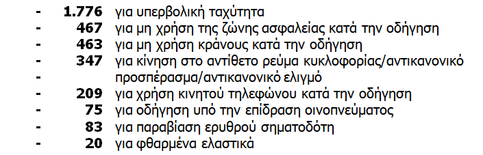 Σημειώνεται επίσης ότι τον προηγούμενο μήνα βεβαιώθηκαν (181) παραβάσεις για στέρηση άδειας ικανότητας οδήγησης, (45) παραβάσεις που αφορούν ανασφάλιστα οχήματα και (439) παραβάσεις επαγγελματικών οχημάτων.