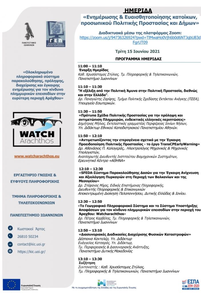 Το Εργαστήριο Γνώσης & Ευφυούς Πληροφορικής, του Τμήματος Πληροφορικής και Τηλεπικοινωνιών, του Πανεπιστημίου Ιωαννίνων την Τρίτη, 15 Ιουνίου 2021 στις 11:00 το πρωί, πραγματοποιεί διαδικτυακή ημερίδα ενημέρωσης και ευαισθητοποίησης, στο πλαίσιο του έργου «Ολοκληρωμένο πληροφοριακό σύστημα παρακολούθησης, πρόληψης, διαχείρισης και έγκαιρης ενημέρωσης για τον κίνδυνο πλημμυρικών επεισοδίων στην ευρύτερη περιοχή Αράχθου» το οποίο χρηματοδοτείται από το Επιχειρησιακό Πρόγραμμα ΗΠΕΙΡΟΣ 2014-2020.
