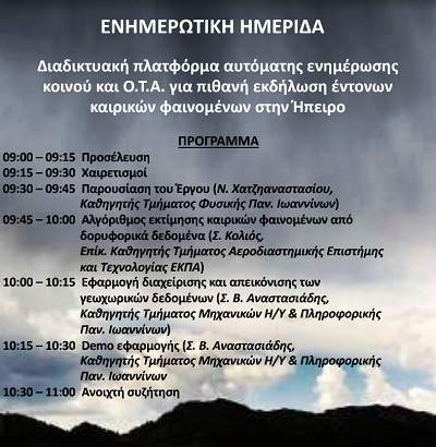 Την Πέμπτη 20 Ιουνίου, στις 9 π.μ. θα πραγματοποιηθεί στο Τμήμα Φυσικής, ενημερωτική ημερίδα σχετικά με την Πράξη «Διαδικτυακή πλατφόρμα αυτόματης ενημέρωσης κοινού και Ο.Τ.Α. για πιθανή εκδήλωση έντονων καιρικών φαινομένων στην Ήπειρο», η οποία είναι ενταγμένη στο Επιχειρησιακό Πρόγραμμα «Ήπειρος 2014-2020», ΕΣΠΑ 2014-2020 και συγχρηματοδοτείται από το Ευρωπαϊκό Ταμείο Περιφερειακής Ανάπτυξης (ΕΤΠΑ).