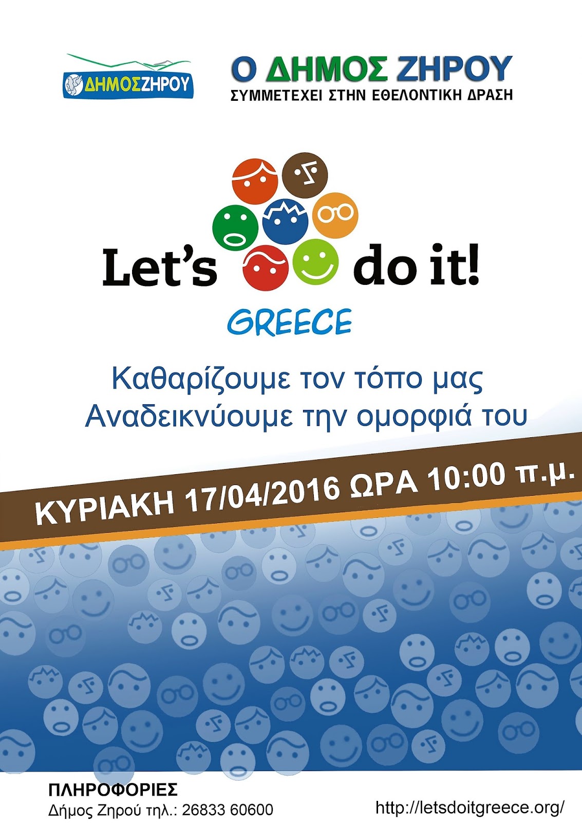 Υπενθυμίζουμε ότι η δράση θα πραγματοποιηθεί την Κυριακή 17 Απριλίου, ενώ θα προηγηθεί η σχολική εβδομάδα «Let’s Do It Greece» από 11 έως 15 Απριλίου, στην οποία θα συμμετάσχουν τα Σχολεία του Δήμου μας.