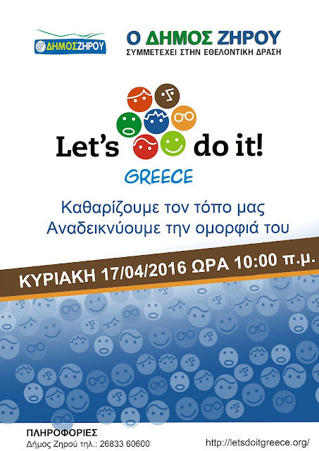 Υπενθυμίζουμε ότι η εθελοντική καμπάνια «Let’s Do It Greece», περιλαμβάνει την υλοποίηση περιβαλλοντικών δράσεων καθώς και τον εξωραϊσμό και την αισθητική αναβάθμιση πολλών και διαφορετικών σημείων του Δήμου, τα οποία ήδη ‘υιοθετούνται’ από συλλόγους και φορείς για τον καθαρισμό και καλλωπισμό τους.
