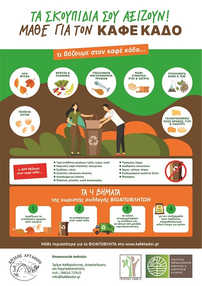 Ο Δήμος Αρταίων καλεί τους πολίτες να χρησιμοποιήσουν τους καφέ κάδους για τη σωστή διάθεση των απορριμμάτων τους. Μέσω της ανακύκλωσης των βιοαποβλήτων, μπορούμε να διατηρήσουμε την πόλη μας καθαρή και βιώσιμη για τις μελλοντικές γενιές.