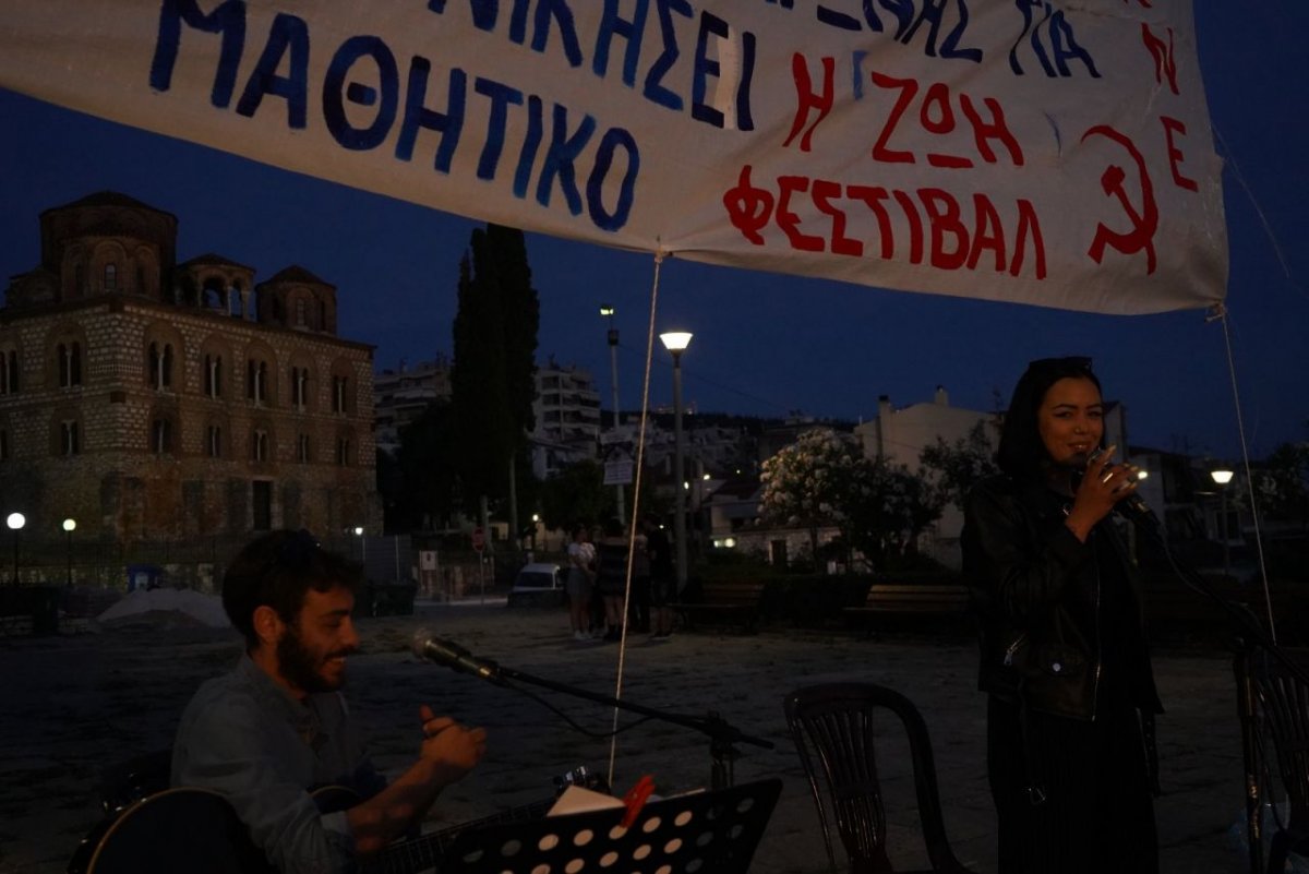 Λίγο μετά τις 8 καθώς ο ήλιος έπεφτε ήταν όλα έτοιμα. Γωνιά για την Παλαιστίνη, γωνιά για το 30ο Αντιιμπεριαλιστικό Διήμερο, έκθεση ζωγραφικής που επιμελήθηκε η 14χρονη Μαρία Αρχιμανδρίτη, έκθεση ενάντια στα ναρκωτικά, έκθεση για τα εργατικά ατυχήματα, που τον τελευταίο χρόνο μετράμε δύο «δολοφονημένους» εργάτες στην πόλη μας, βιβλιοπωλείο. Τα μουσικά όργανα κουρδισμένα και οι καλλιτέχνες στις θέσεις τους.