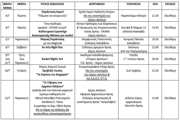 Ο Δήμος Αρταίων ανακοινώνει το «Πολιτιστικό Καλοκαίρι 2024», μια συναρπαστική σειρά εκδηλώσεων που θα γεμίσει την πόλη με τέχνη, παράδοση και ψυχαγωγία. Συνεχίζοντας την επιτυχία των «Ελευθέριων 2024», το Πολιτιστικό Καλοκαίρι, έρχεται να προσφέρει στους κατοίκους και τους επισκέπτες μια πληθώρα εκδηλώσεων.