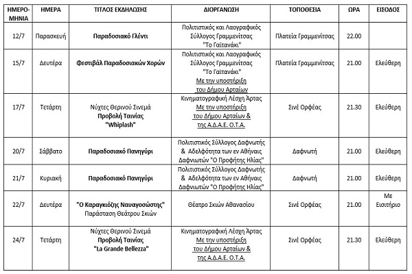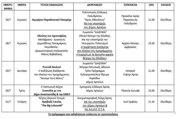 - «Πλούτος» του Αριστοφάνη – Κυριακή 28 Ιουλίου: Η κλασική κωμωδία του Αριστοφάνη, που διερευνά την κοινωνική ανισότητα και τη διανομή του πλούτου, θα παρουσιαστεί σε μια νέα προσέγγιση από το Εθνικό Θέατρο, στο Αρχαίο Θέατρο Αμβρακίας. Το έργο, που εντάσσεται στο πρόγραμμα «Γνωριμία με τα άγνωστα αρχαία θέατρα της Ελλάδας», θα προσφέρει στους θεατές μια μοναδική εμπειρία σε ένα αρχαίο και αυθεντικό σκηνικό.