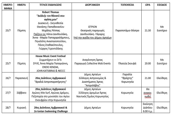 Παράλληλα, διεξάγεται ο 20ς Διάπλους Αμβρακικού με πλήθος εκδηλώσεων και δράσεων στην Κορωνησία, η 2η Εκπτωτική Νύχτα με συναυλία με τον Δήμο Αναστασιάδη και την Emily, που είναι μια διοργάνωση του Δήμου Αρταίων και του Εμπορικού Συλλόγου Άρτας, House Music Event, Festival από την «Αναγέννηση» Άρτας και διαλέξεις στον αύλειο χώρο του Αρχαιολογικού Μουσείου.