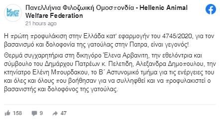 Θερμά συγχαρητήρια στη δικηγόρο Έλενα Αρβανιτη, την εθελόντρια και σύμβουλο του Δημάρχου Πατρέων κ. Πελετιδη, Αλεξανδρα Δημοπουλου, την κτηνίατρο Ελένη Μπουρδακου, το Β´ Αστυνομικό τμήμα για τις ενέργειες του και όλες και όλους που βοήθησαν για να συλληφθεί και να προφυλακιστεί ο βασανιστής και δολοφόνος της γατούλας.