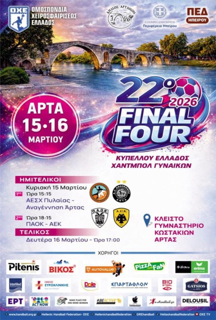 Το 22ο Final Four Κυπέλλου Ελλάδος Χάντμπολ Γυναικών, θα φιλοξενήσει η Άρτα για δύο ημέρες, Κυριακή 15 και Δευτέρα 16 Μαρτίου 2026.