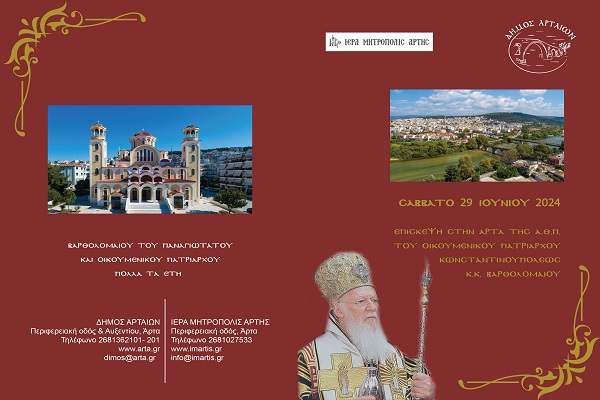 Με ιδιαίτερη χαρά και τιμή, η πόλη της Άρτας υποδέχεται την Αυτού Θειοτάτη Παναγιότητα, τον Οικουμενικό Πατριάρχη Κωνσταντινουπόλεως, κ.κ. Βαρθολομαίο. Η έλευση του Παναγιωτάτου θα πραγματοποιηθεί το Σάββατο 29 Ιουνίου 2024 και αποτελεί ένα ξεχωριστό γεγονός για την τοπική κοινωνία, αναδεικνύοντας την πνευματική, πολιτιστική και ιστορική σημασία της περιοχής μας.